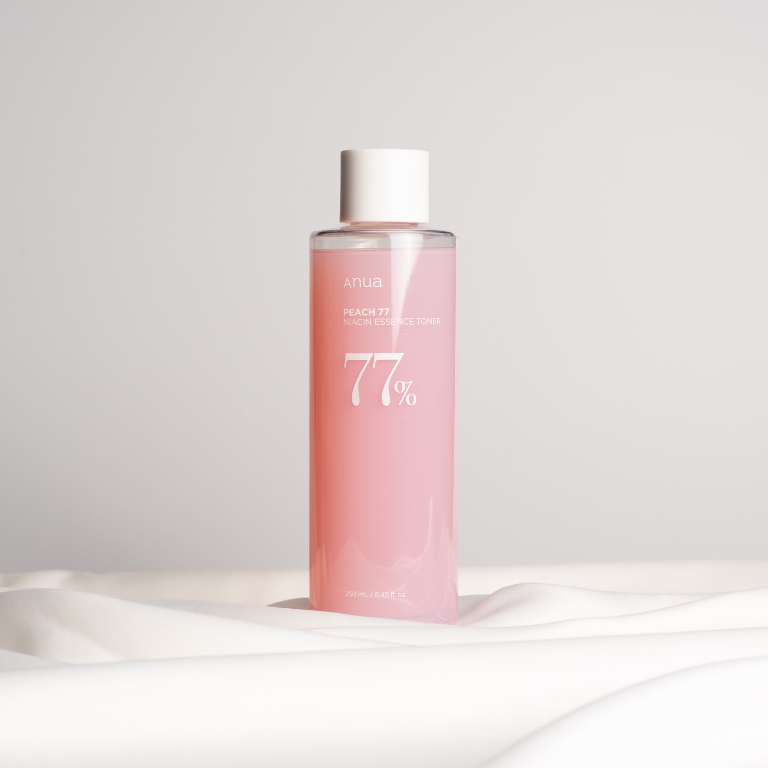 Peach 77 Niacin Essence Toner od značky Anua je sjednocující toner, který kombinuje účinky broskve, niacinamidu a probiotik, aby poskytl pleti potřebnou hydrataci, rozjasnění a regeneraci. Broskev je bohatá na vitamíny a antioxidanty, které vyživují a hydratují pokožku. Niacinamid pomáhá sjednotit tón pleti, zlepšuje texturu a redukuje viditelnost pigmentových skvrn, a probiotika pomáhají posílit přirozenou bariéru pokožky, podporují její zdraví a zklidňují podráždění. Tento toner poskytuje pleti intenzivní hydrataci a výživu, zanechává ji hladkou, revitalizovanou a připravenou na další kroky v péči o pleť. Vhodný pro všechny typy pleti.