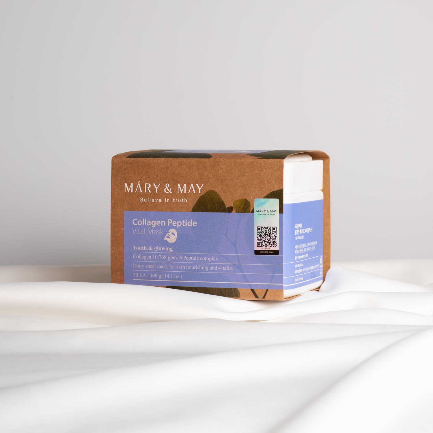Collagen Peptide Vital Mask od Mary&May je inovativní maska složená z luxusní směsi kolagenu, peptidů a alantoinu, které pracují v harmonii pro ty nejlepší výsledky. Kolagen je klíčem k pevnosti a pružnosti pleti, pomáhá vyplňovat vrásky a zanechává pleť vyživenou a hydratovanou. Peptidy hloubkově regenerují pokožku, podporují tvorbu nových buněk a zajišťují mladistvý vzhled. Allantoin zklidňuje a hydratuje, minimalizuje podráždění a pomáhá urychlit regeneraci. Po použití této masky zajistíte pleti okamžitou hydrataci a posílení. Vhodné pro všechny typy pleti.