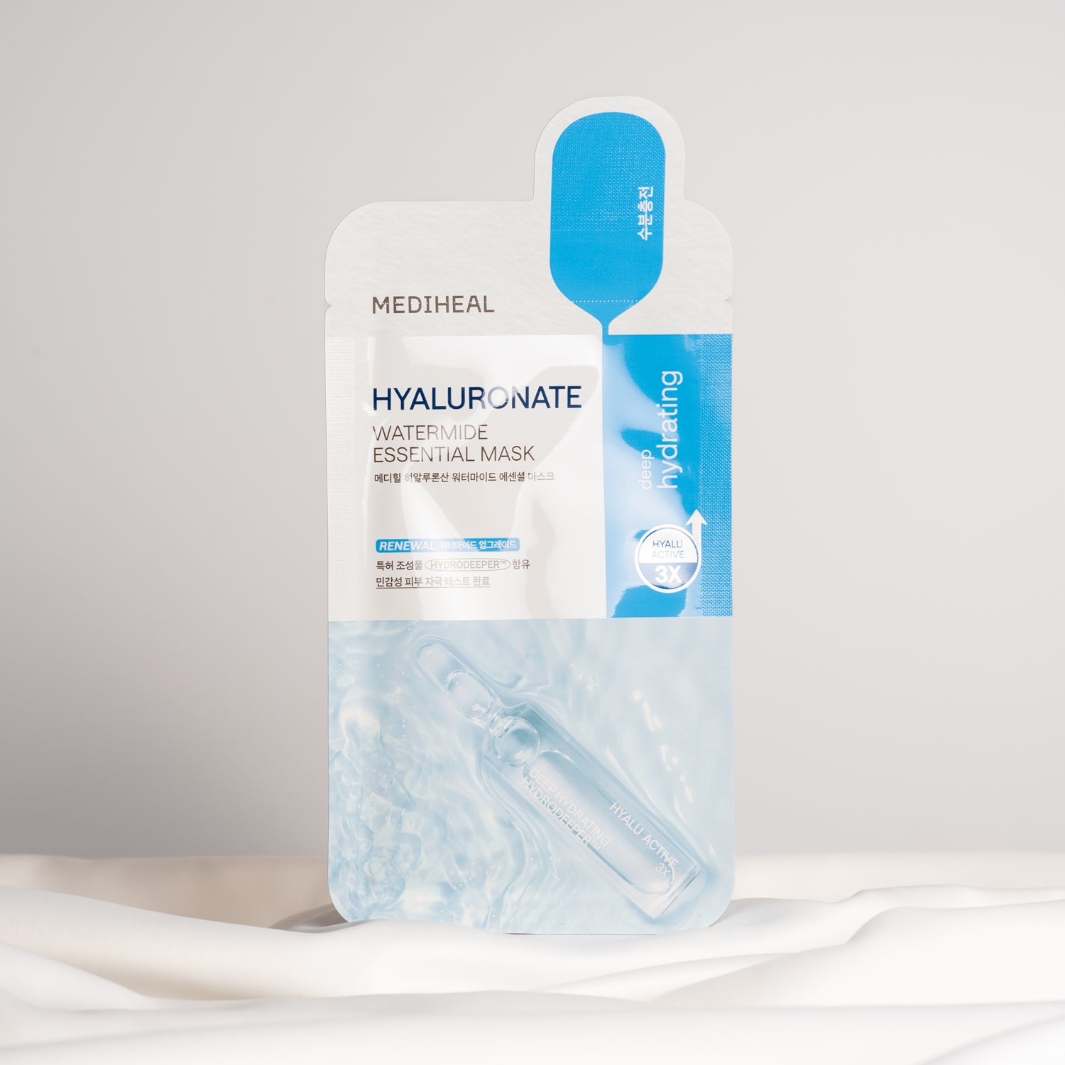 Mediheal Hyaluronate Watermide Essential Mask je hydratační a osvěžující maska, která hluboce vyživuje a omlazuje tak pokožku. Obsahuje mořskou vodu, jejíž hlavním účinkem je hydratace a tím také posiluje kožní bariéru. Díky panthenolu se tato schopnost zdvojnásobí a maska tak zanechá pleť dlouhodobě hydratovanou a bez podráždění. Maska také obsahuje niacinamid, který pomáhá v boji s viditelnými póry a nerovnoměrným tónem pleti. Vaše pokožka bude po použití Hyaluronate Watermide Essential Mask rozjasněná, hladká a zářivá. Produkt je vhodný pro všechny typy pleti, zejména pro suchou a zralou pleť.
