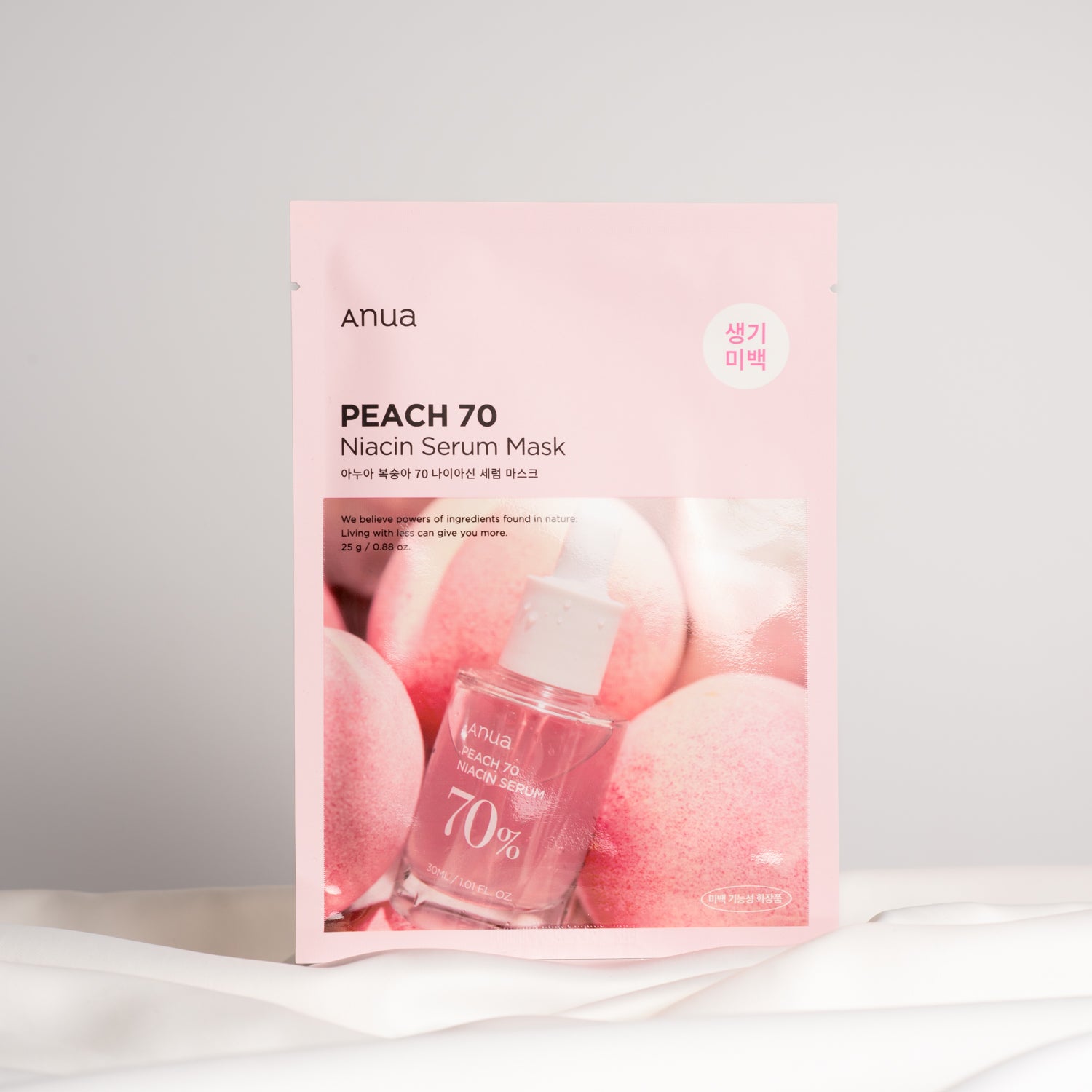 Peach 70 Niacin Serum Mask od značky Anua je vyživující a rozjasňující maska pro obnovu pleti. Hlavní složku tvoří extrakt z broskve, která pokožku regeneruje, zklidňuje podráždění a hluboce vyživuje. Produkt dále obsahuje niacinamidy, které sjednocují tón pleti a regulují tvorbu kožního mazu, a allantoin, který ji zklidňuje a udržuje chráněnou. Vyzkoušejte tuto masku i vy a dopřejte své pokožce péči jako od profesionálů. Produkt je vhodný pro všechny typy pleti.